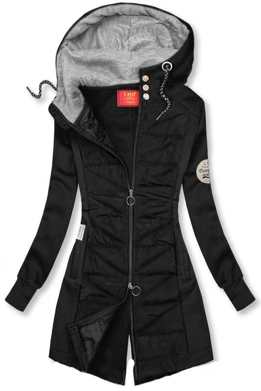 Pevnější, příjemný materiál , mladistvý prodloužený zeštíhlující střih s kapucí.