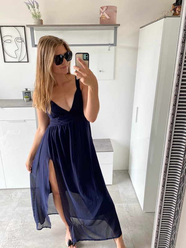 Dámské šifónové šaty s hlubokým výstřihem, dvojitými ramínky a vysokým rozparkem.